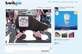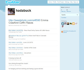 Another service with a few more features is TweetPhoto. To join the service is as easy as logging in with your same Twitter username and password. Again, same procedure as Twitpic, browse your hard drive and load a photo. Now, type in your message. Then, you can add tags to your photo. So for my photo of the Emma Crawford Coffin Races, I tagged it "emma crawford, coffin races, manitou springs". This way, people searching for any of those terms may find my photo. You then click "upload now", and voila! Your Tweet contains a URL for the photos.