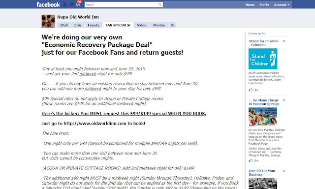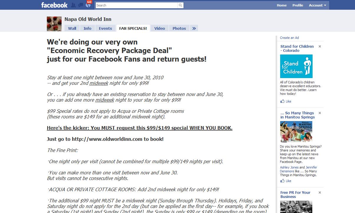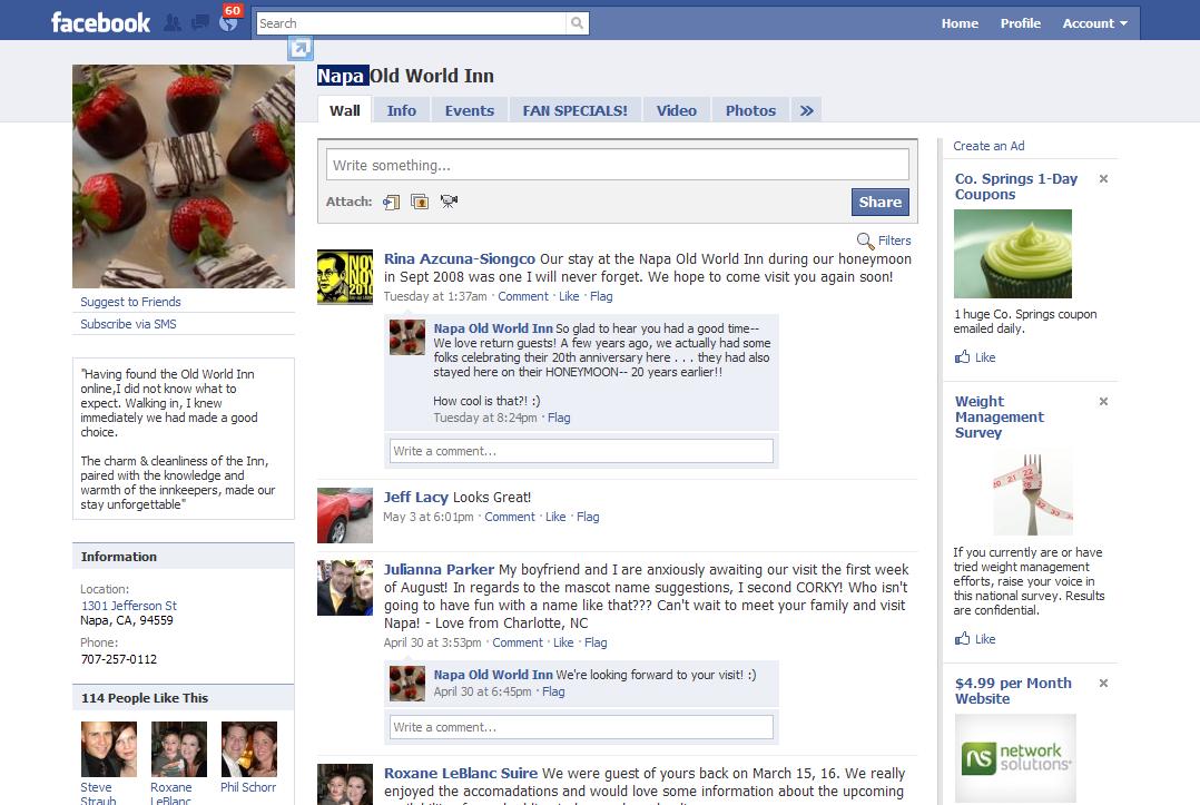 A few customers have noticed a new feature to Facebook, which is to be able to add customized content to your pages. For an example, see this page from the Old World Inn in Napa, CA: