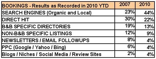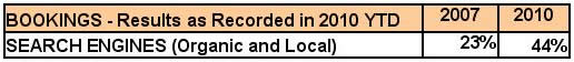 We have broken these booking sources down into 7 categories and compared them to 2007. We chose 2007 because in 2007 booking statistics did not include Google Places Business Listings. IE: “The 7 Pack” that is displayed on organic searches, shown beside the Map in www.google.com.