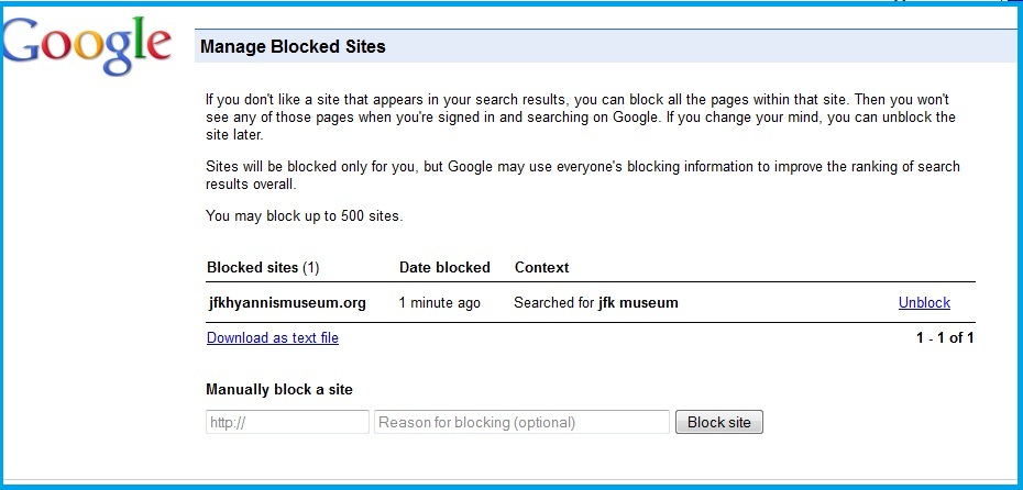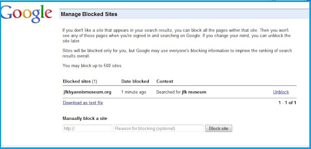 Google has opened up a new feature- when you're signed in to Google, you can block a specific website from appearing in your future search results. You may have noticed this new feature recently, and wondered what it was. Google conceals the site you "block" from results so that you don't see results from that site. When you want to see the results again, you can unblock the site.