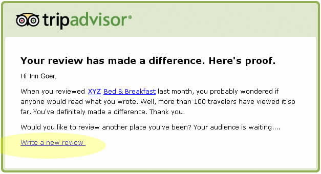 Did you know that TripAdvisor is sending their subscribers emails that look like this one below?  They remind them the review they wrote has been "READ" by x number of travelers, and then encourage the subscriber to "Write a New Review".   Amazing the tactics these companies are using to entice the user to "talk" about you!