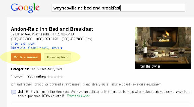 Notice how with the most recent display changes in Google Places that they are now encouraging the user to Write a Review and Upload an Image practically at the very top of the results page?  This would allow a user to write a GOOGLE REVIEW by clicking this button.